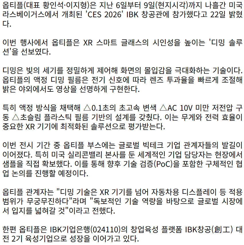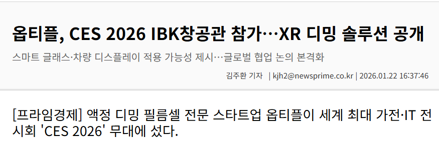 우리 회사는 CES2026에서 XR 디밍 솔루션을 공개하며 프라임경제 신문사에 기사가 게재되었습니다.
